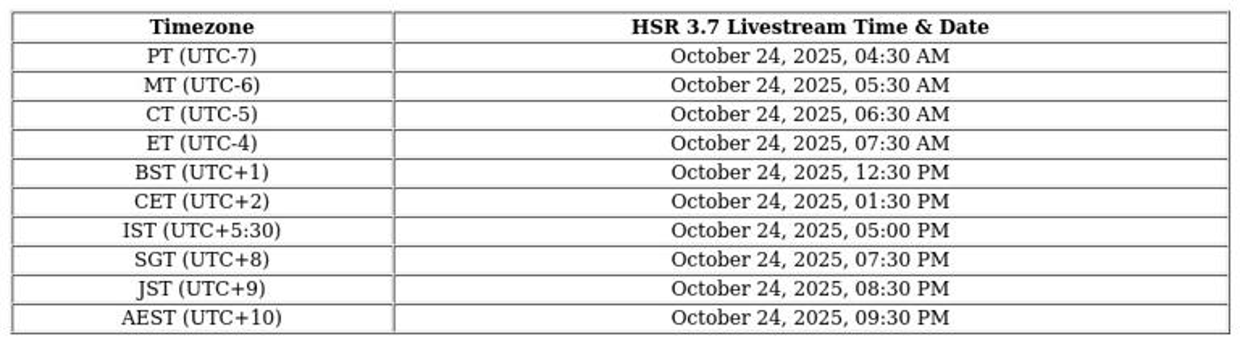 The live broadcast for Honkai Star Rail version 3.7 is scheduled to take place on October 24, 2025, at 7:30 AM local time (UTC-4).