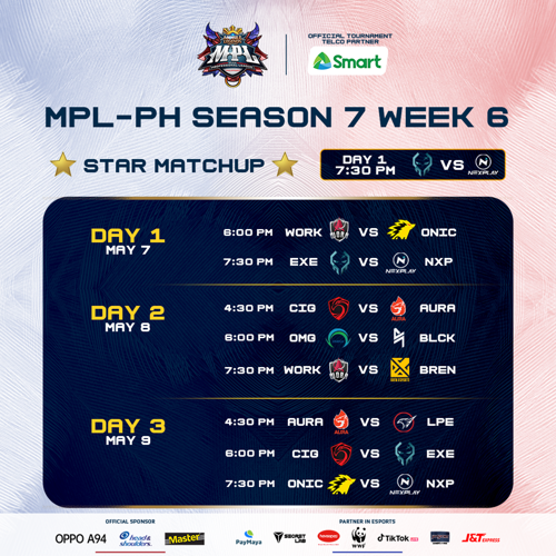 On Friday, May 7th, the action kicks off with Onic PH facing Work Auster Force, followed by Execration battling Nexplay Esports. Saturday, May 8th, will see Aura PH take on Cignal Ultra, Smart Omega go up against Blacklist International, and Work Auster Force face Bren Esports. The weekend concludes on Sunday, May 9th, with Aura PH clashing with Laus Playbook Esports, Cignal Ultra competing against Execration, and Onic PH returning to meet Nexplay Esports.